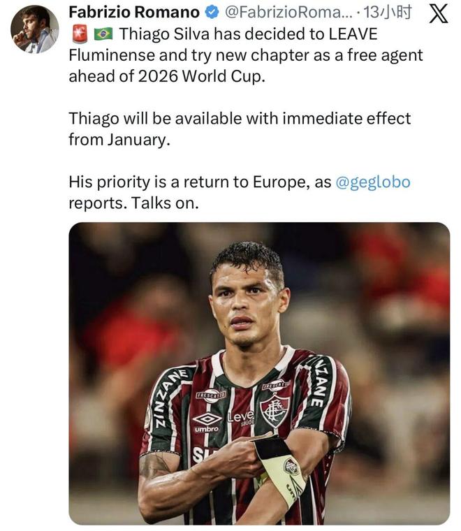 如今按照罗马诺的说法,蒂亚戈-席尔瓦已经决定在明年1月离开弗鲁米嫩塞,在2026年世界杯前以自由球员的身份开启新篇章。