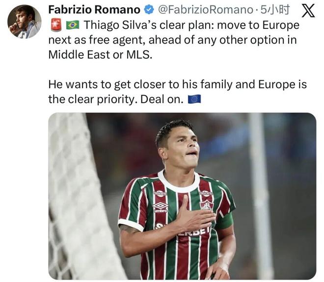 41岁的蒂亚戈-席尔瓦去年夏天从切尔西自由转会回到了弗鲁米嫩塞,他的现有合同将在明年6月到期。